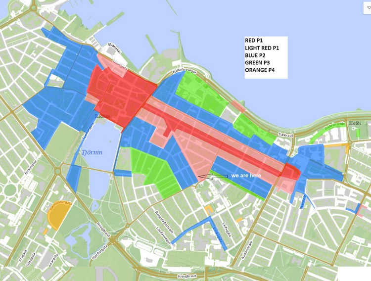 - The paid period in tariff zones P1 is 600 kr per hour from 9am - 9pm - The maximum time in tariff zone 1 is three hours.